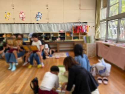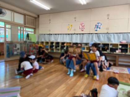 その後の「お話タイム」では、お家の人の膝にのせてもらったり、ござの上で横並びになったりして、親子でお話を楽しむ姿が微笑ましかったです。
