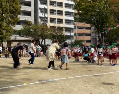 未就園児さんのかけっこ「ここまでおいで」では、緑組さんが優しくお土産を手渡してくれました。