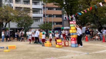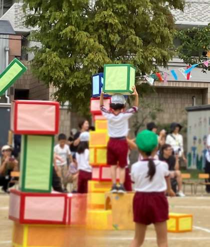 いろいろな大きさの段ボールを高く積み上げる競争です。
