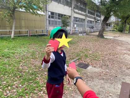また、公園のあちらこちらに金の星や赤いハートのお宝を隠してくださり、みんなで、宝探しをしました。子どもたちは大喜び!!見つけたお宝をプレゼントしてくださいました。
