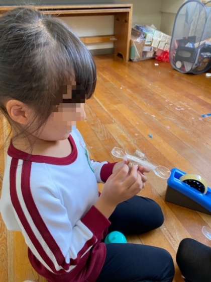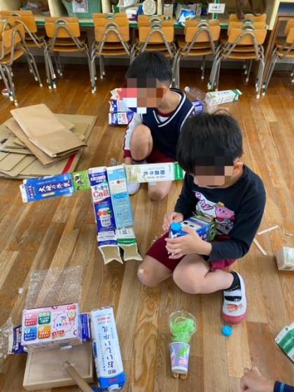 5歳児緑組の製作で、子どもたちは自分の思いを実現させるのがとても上手です。「先生、見て見て。これは◯◯やねん」「これは◯◯で、こうやって遊ぶねん」などと沢山お話を聞かせてくれます。教師は子どもたちの発想に驚きの連続で、褒めたり認めたりします。