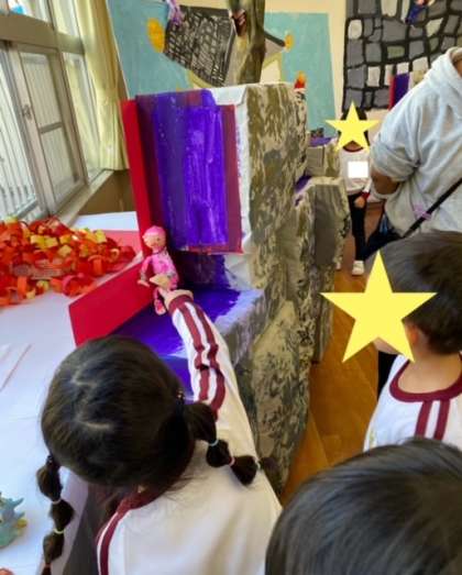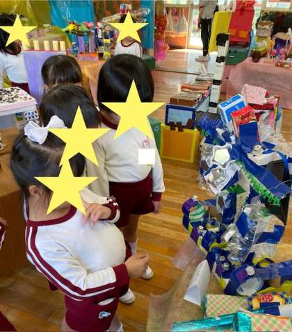 4歳児黄組は「これはなんだろう」「こんなところに忍者がかくれていたよ」などなど、興味津々で5歳児緑組の作品を見て、憧れの気持ちを抱いていました。