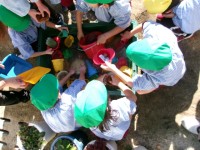 5歳児緑組親子は、親子で協力して波に見立てた棒を持って走り、ぐるりと回って帰ってきます。お家の方の真剣に走る姿が印象的でした。