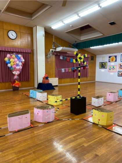 こどもてんらんかい8 公開日 2024/11/22 更新日 2024/11/22 幼稚園日記 遊戯室には、運動会で使った開会式の気球や万国旗、桃組の電車、そして、緑組と黄組の子どもたちの絵を展示しました。 電車に乗って遊んだり、気球の前で写真を撮ったりしました。 いいね(0)