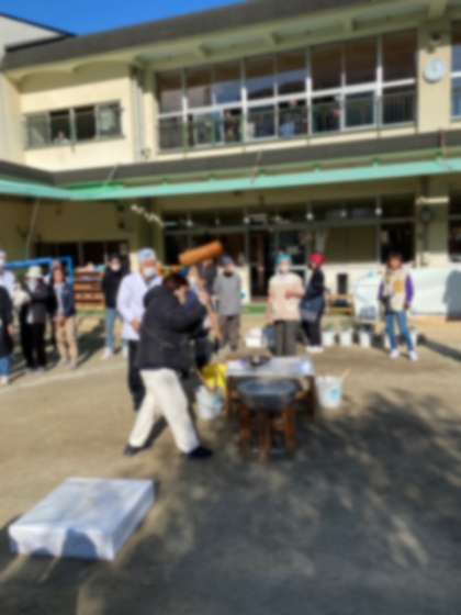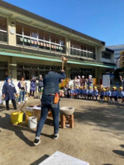 そして、もちをついていただきました。「ママ、頑張って!!」の声援に保護者の皆さんの杵に力がこもります。