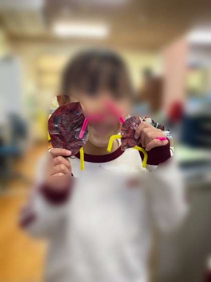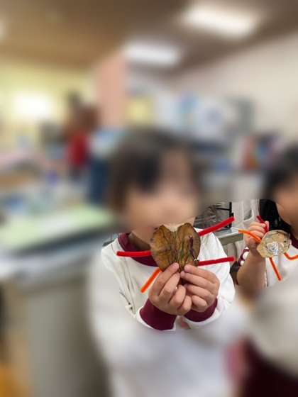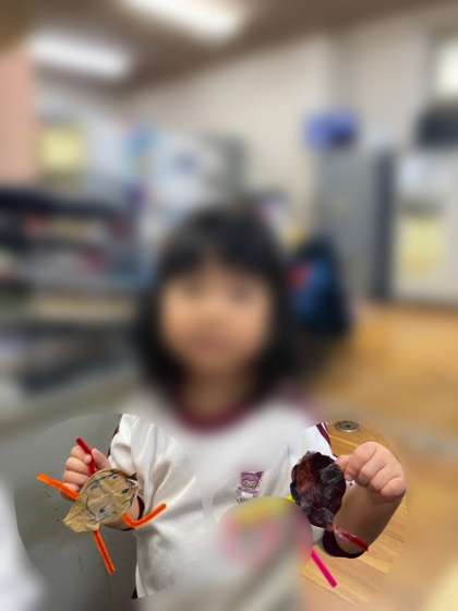 「これはママとお姉ちゃん」「これはパパ」と葉っぱに顔をかいて手足をつけ、見せに来てくれました。