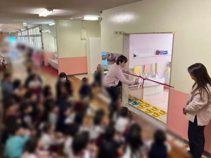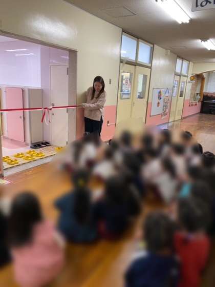 今日はみんなで集まって、園長先生がテープカットをしました。