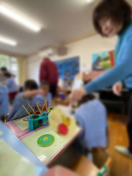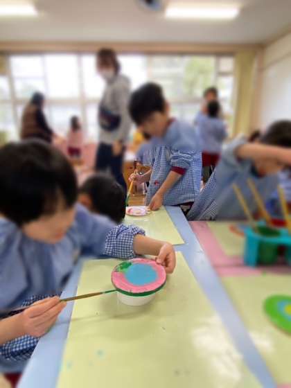 5歳児緑組は、丸い木の板に絵の具で絵や模様をかきました。