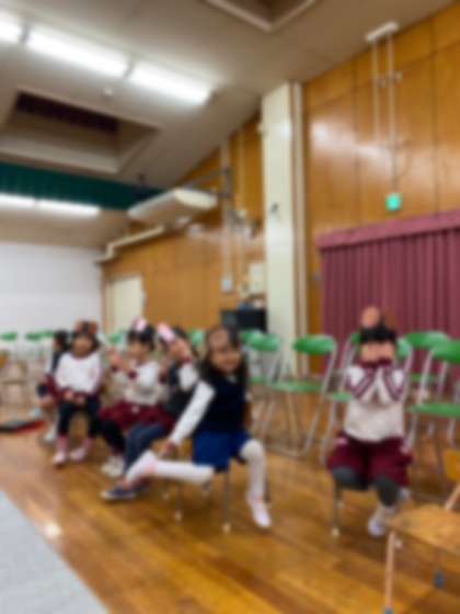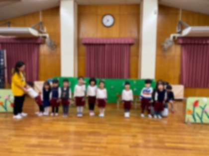 桃組は「でんしゃにのって」のお話で遊んでいます。いろいろな動物が電車に乗ってお出かけします。どこへ行くのかな…