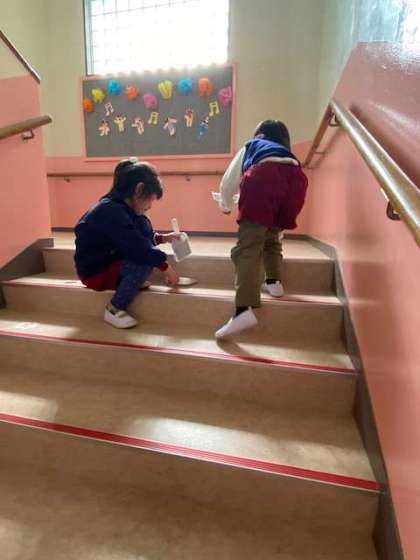 防犯訓練の後は… 公開日 2025/02/17 更新日 2025/02/17 幼稚園日記 防犯訓練をしました。 今日は園庭から室内に避難する設定で、外靴のまま速やかに室内に避難しました。 訓練の後は、砂だらけになった廊下や階段を、子どもたちがお掃除してくれました。 いいね(0)