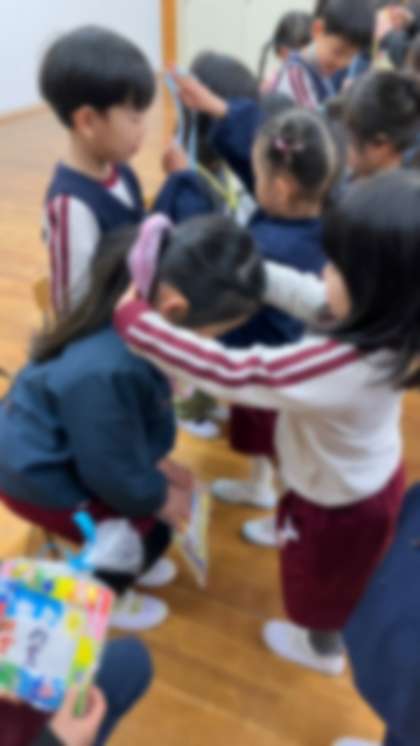 緑組さんにプレゼントをつくって渡しました。黄組さんは、手づくりフォトフレーム。桃組さんは、キラキラペンダントです。