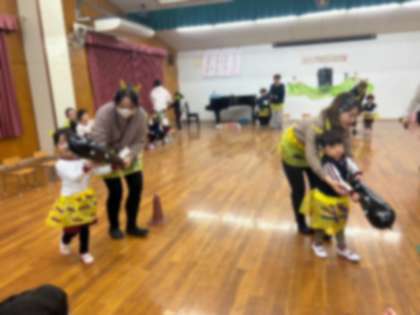 誕生児とお家の人のふれあい遊びは、鬼のパンツを履いて、頭にはツノをつけ、金棒を持って一緒に走ります。