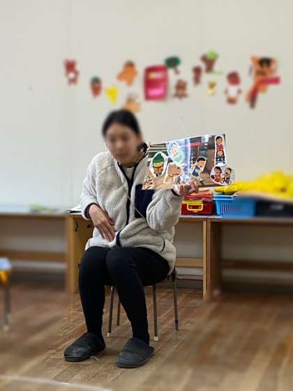 年中黄組が、保健指導を受けました。「幼稚園の中で、危ないところはどこかな…」と、写真を見ながらみんなで考えました。
