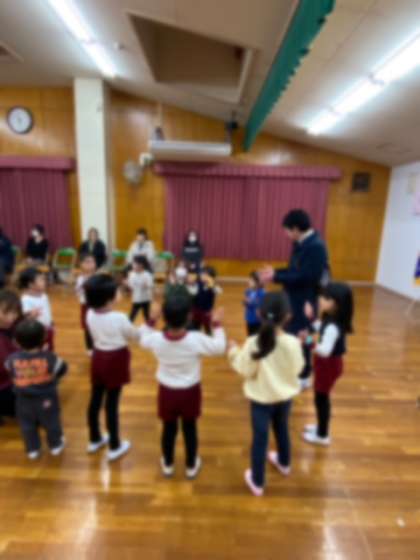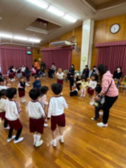 年中黄組さん、年少桃組さんと一緒に「パンダ・ウサギ・コアラ」の手遊びをしたり、みんなでを手をつないで輪になって「友達できちゃった」の曲に合わせて踊ったりしました。