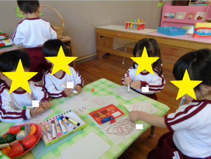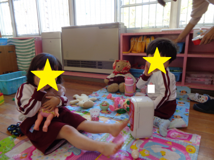 登園して朝の身支度ができると、友達や先生と一緒にままごとをしたり、お絵かきしたりして遊んでいました。