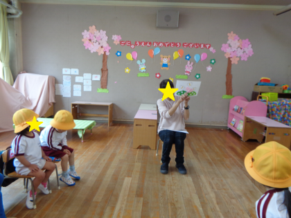 降園前には、チョウチョが登場。先生の歌に合わせてチョウチョがいろいろなお花にとまるお話をじっと見入っていた子どもたち・・・