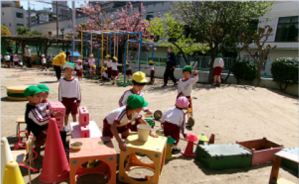 戸外では、自分たちでカラーボックスや巧技台を運んできて、遊び場をつくり、ごっこ遊びをしています。緑組、黄組、桃組も仲間に入って、楽しそうですね!!