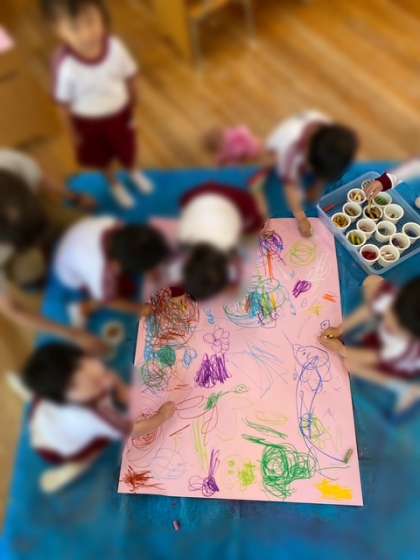 みんなで絵をかいたよ 公開日 2025/04/21 更新日 2025/04/21 幼稚園日記 3歳児桃組さんは、大きな紙にパスでお絵かき… みんなでグルグル、腕を動かして遊びました。 友達と一緒だとかくことが楽しくなるね!! いいね(0)