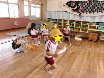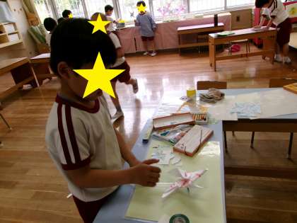 5歳児緑組さんがお外で遊んでいると、気持ちいい風が吹いてきました。ふと見上げるとこいのぼりも気持ちよさそうに空を泳いでいます。「そうだ!!風でくるくる回る風車をつくろう」と言うことになり、先生と一緒に穴を開けて、難しいところも頑張ってつくりました。