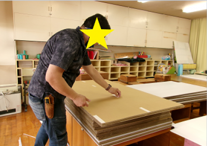 事業担当主事さんが、先日から事務や環境整備の合間をぬって、段ボールを重ねて貼り合わせ、コツコツと何かをつくってくれています。