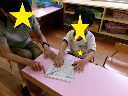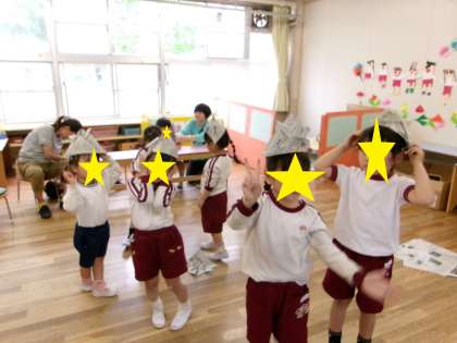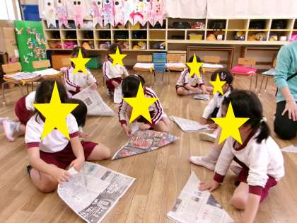 新聞紙で兜を折りました。参観の日に親子で色紙で兜を折る経験をしていたので、「つくり方、知ってる!」と嬉しそうに新聞紙で兜を折っていました。「分からない…」と言っている友達に、「ここ折るねん」とやさしく声をかけている姿も見られました。出来上がると子どもたちは「見て!見て!」ととても嬉しそうでした。