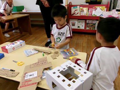 年長組とはいえ、お家の人が来られるとやっぱり嬉しい様子。お弁当を口いっぱいにほおばっていました。お弁当の後は、静かに絵をかいたり、つくったりするところも見てもらいました。