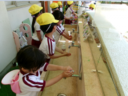 熱中症が心配な季節でもあります。戸外で遊ぶ時間を少なめにしたり、お茶タイムを何度も取るようにしたりしています。お茶やお水を飲む前には、ちゃんときれいに手を洗って「いただきます」よく動いた後のお茶やお水はおいしいね。