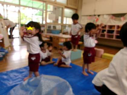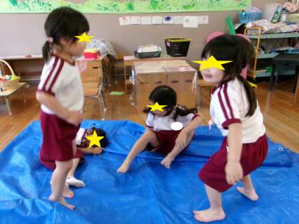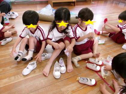 遊んだ後は、自分で靴下を履いてみんなでシートをたたみました。後片付けもバッチリです。