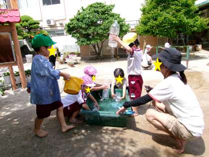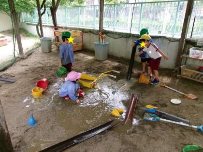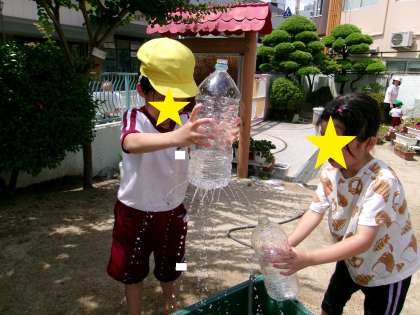 樋(とい)にどんどん水を流していると…大きなお池ができて、裸足でバシャバシャと歩いています。底に小さな穴が沢山開いたペットボトルに水を入れると…シャワーになります!!冷たい水に触れると心地よく、存分に遊びました。6月とはいえ暑くなってきました。みんなで夏の遊びをどんどん楽しみましょうね。