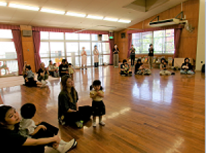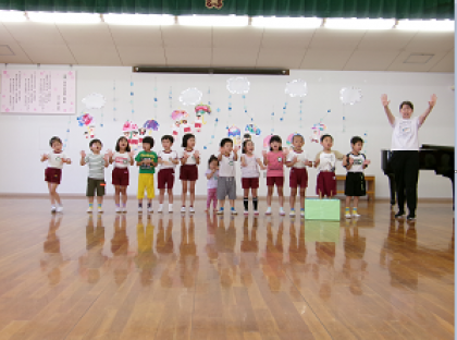 未就園児さんが、沢山遊びに来てくれました。子育て支援室(涼しいお部屋)で好きな遊びをした後、遊戯室に集まって、年長緑組さんと「むしむしじゃんけん」をしたり、「めざせチャンピオン」(体操)をしたりしました。