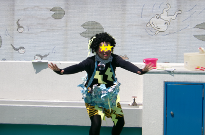 先生たちがプールのお約束を、実演しながら楽しく知らせました。