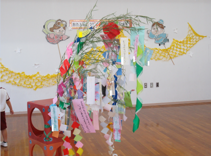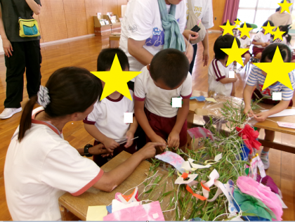 始まる前に、大笹に子どもたちがつくった笹飾りを自分で結びました。年長緑組さんは、年中黄組や年少桃組の友達にやさしく結び方を教えてあげたり、結んであげたりしていました。