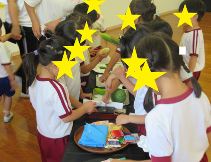 お星さまにお供えする墨やすずり、裁縫道具、夏野菜やスイカなどを、興味津々で見ていました。