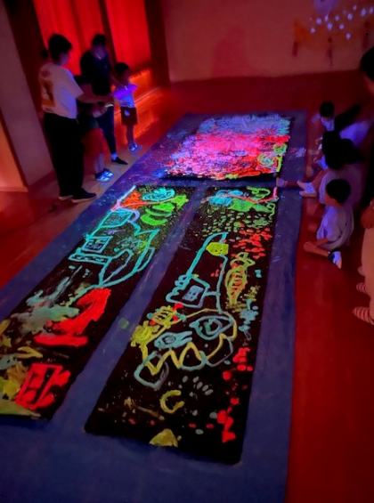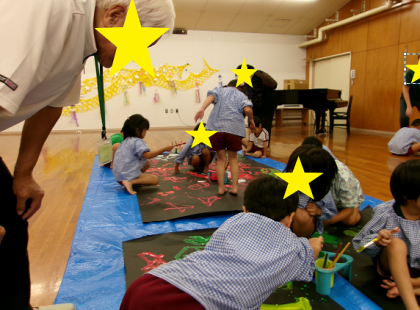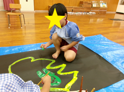 遊ぼうデー1 公開日 2025/07/11 更新日 2025/07/11 幼稚園日記 今日は遊ぼうデー。地域の方たちと幼稚園で一緒に遊びます。 年長緑組は、夜空に見立てた大きな黒い模造紙に、蛍光絵の具でプラネタリウムで見た星座や、自分で考えた星座をかきました。 最後にブラックライトで照らすと「うわー、きれい!!」とっても素敵なプラネタリウムができあがりました。 地域の皆さんが、やさしく「何をかいてるの」「上手だね」と言ってくださるので、嬉しくなって筆が進みました。 いいね(0)