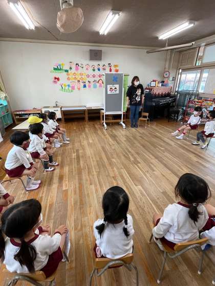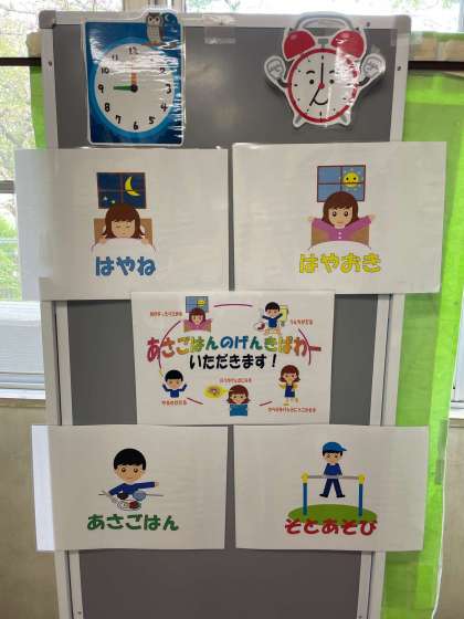 そして、今日は『早寝、早起き、朝ごはん』の保健指導です。早く寝るから、早く起きられて、朝ごはんをしっかり食べると幼稚園で元気に遊べるというお話です。黄組のお友達はみんな、朝ごはんを食べて幼稚園の開門時間に間に合うように登園してくれました!夜9時には寝て、朝は7時に起きる!これからも続けていきましょうね!