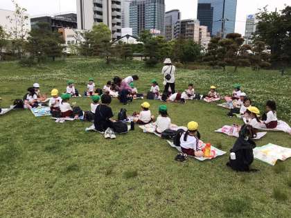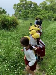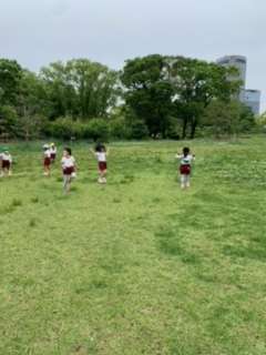 お花を摘んだり、虫探しをしたり、友達と鬼遊びをしたり、、身近な自然に触れながら体をたくさん動かして遊びました。とっても楽しかったです。