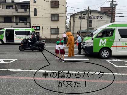 バイクや車が動いている中で、横断歩道や踏み切りを安全に渡る練習をしました。