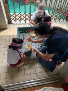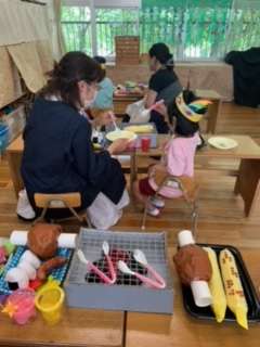 スーパーボールすくいをしたり、BBQごっこでたくさんのごちそうを食べたりして、おうちの人と一緒に思い切り遊ぶことができました。