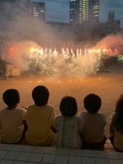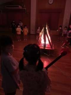 終業式の日の夕方、年長みどり組さんで集まって夕涼み会を行いました。いつもとちがう時間に友達と集まるどきどきわくわくした気持ちで登園してきたこどもたち。遊戯室でキャンプファイアーを囲んで、歌を歌ったりゲームをしたりして楽しみました。最後には花火を見て、すてきな夏の思い出になったことと思います。おうちの方たちの子どもたちに楽しんでほしいと思う気持ちから、実施することができました。