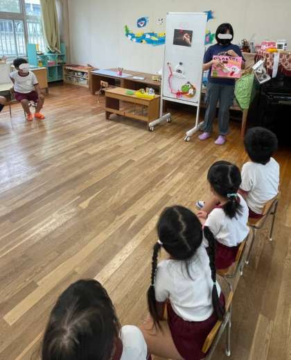 黄組さんにも、色々なお箸の持ち方でハンバーグを食べられるのか、先生が実践して見せ、正しいお箸の持ち方を伝えました。