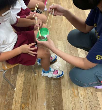 各自にお箸を配り、一緒に持ち方の確認をし、1人ずつお箸で食べ物を掴む練習をしました。