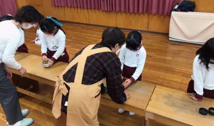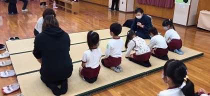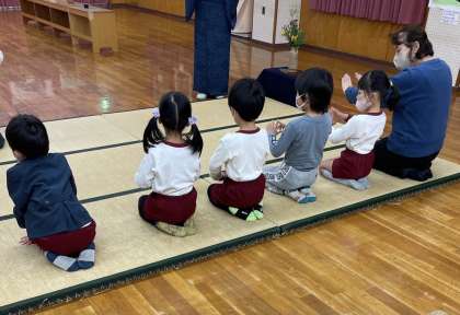 お茶の先生と更生保護女性会の方が来てくださり、5歳児みどり組に礼儀作法やお茶、お菓子のいただき方などを教えてくださいました。