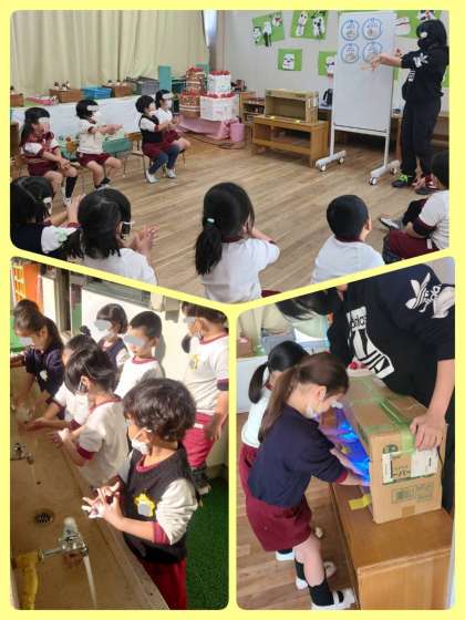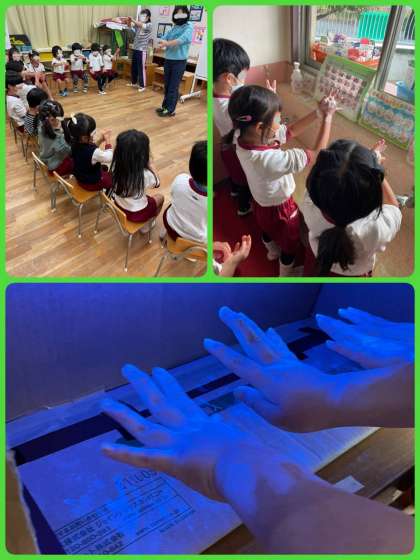 手洗いチェッカー(専用の液体を手に付けて、ブラックライトで汚れを確認するもの)を用いて、正しい手洗いの方法を確認しました。