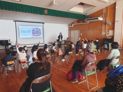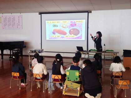 桜宮小学校から栄養教諭に来ていただき、5歳児が食育や、給食についてのお話を聞きました。