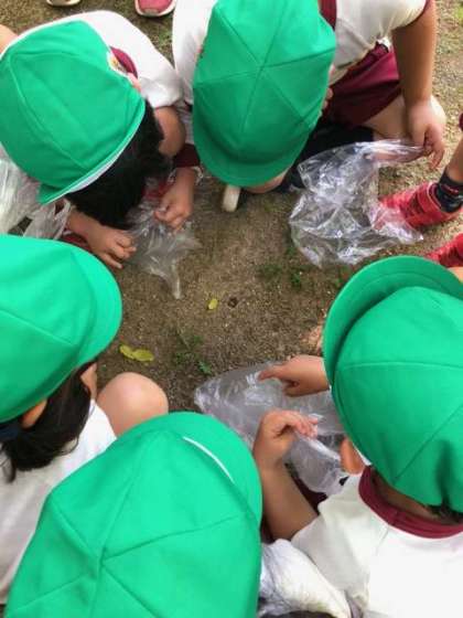 年長さんは穴の中にいる蝉の幼虫を見つて興味津々。