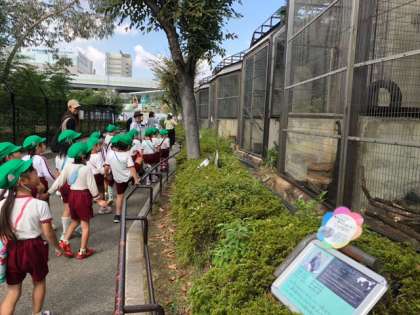 動物園に到着するとクラスでの行動です。お弁当を食べる場所にリュックサックを置いて早速動物たちに会いに行きました。