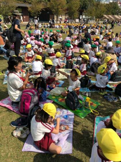 園内に残してきたリュックサックを受け取り、広い芝生の広場に移動して昼食タイム。たくさん歩いてお腹がペコペコなので、とっても美味しいおにぎりで元気いっぱいになりました。