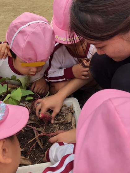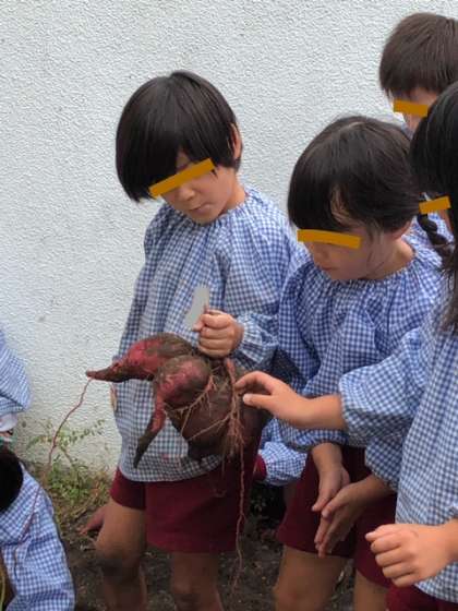 幼稚園の畑と園庭のプランターで育てていたさつまいもをみんなで収穫しました。