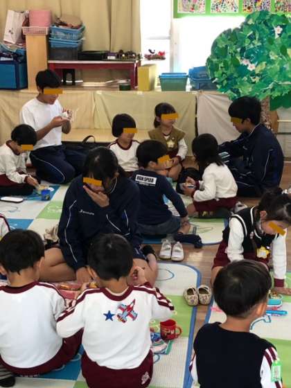 普段触れ合うことの少ない大きなお兄ちゃんお姉ちゃんに初めはびっくりしていた子どもたちも、来週に控えた展覧会の作品作りのお手伝いをしてもらったり、一緒に遊んでもらったりして、お兄ちゃん先生、お姉ちゃん先生ともすっかり仲良くなりました。