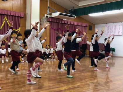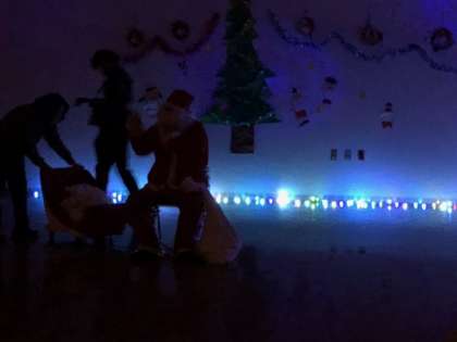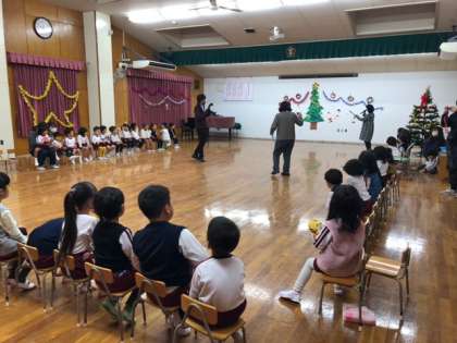 それぞれのクラスで準備してきた歌や楽器遊び、ダンスを披露して会場が盛り上がってきたとき、鈴の音が聞こえてとうとうサンタさんがやってきました!!